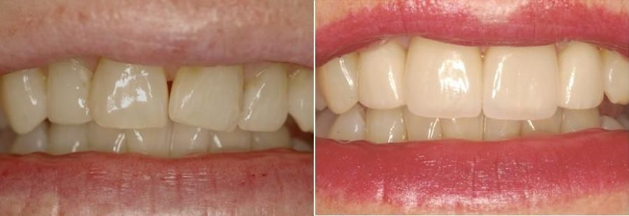 Mit Keramikschalen (Veneers) wurde ein kleinerer Zahnbogen mit kürzeren Zähnen gestaltet. Die neue Zahnform schließt die dunklen Bereiche zwischen den Zähnen.