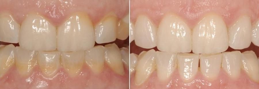 Viele Reparaturen mit verfärbtem Kunststoff sowie die durch Abrasion veränderte Zahnform beeinträchtigen das ästhetische Erscheinungsbild der Zähne.