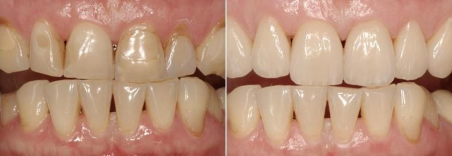 Nach der Revision der Wurzelfüllung erhielt der Zahn durch Bleichen seine ursprüngliche Farbe zurück. Eine Überkronung wurde so vermieden.